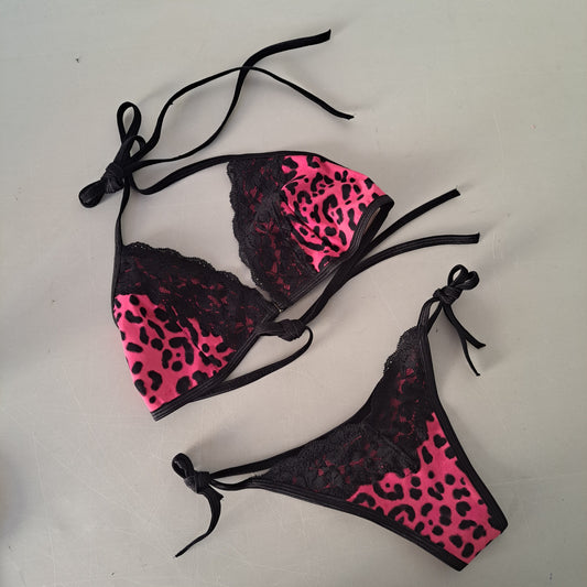 Completo bikini string lace maculato fucsia